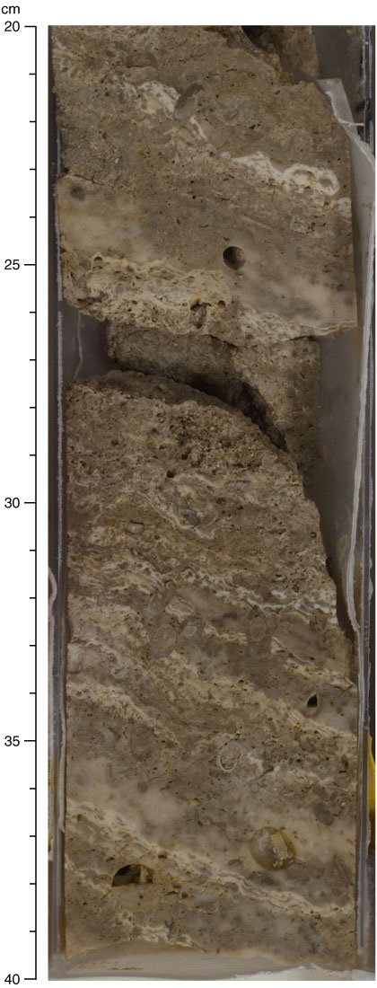 Figure F5. Coralgal bindstone with interlayered coralline algae and encrusting colonies of Porites and agariciids (Subunit IA; interval 310-M0015B-1R-1, 20–40 cm).