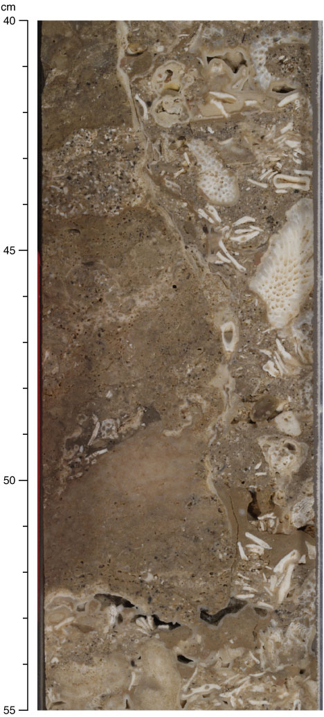 Figure F54. Skeletal rudstone with Halimeda segments, coral fragments, and reworked carbonate cobble (Unit II; interval 310-M0015B-38R-3, 40–55 cm).