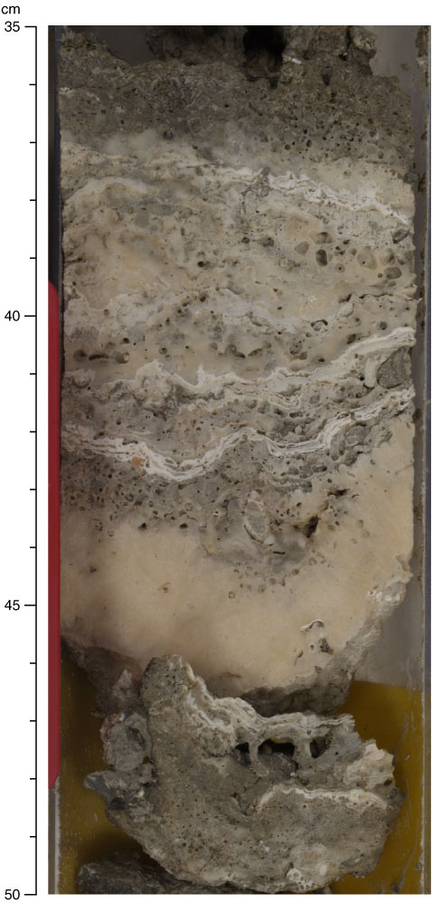Figure F6. Interlayered encrusting coralline algae (Subunit IA; interval 310-M0015B-2R-1, 35–50 cm). Note intense bioerosion of coral colonies.