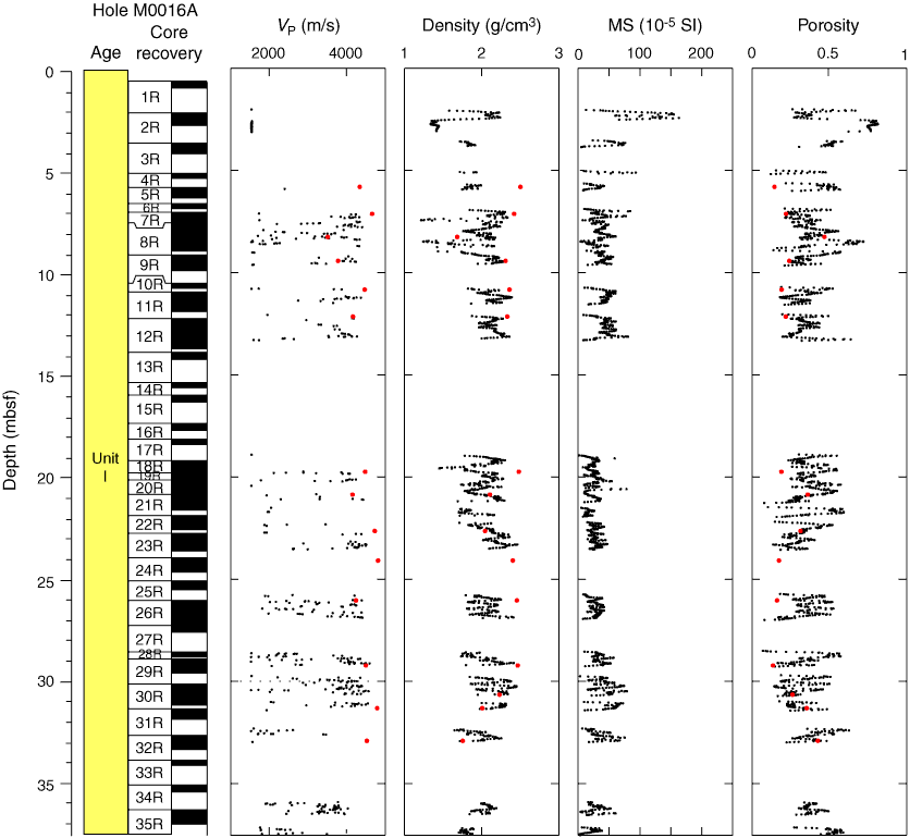 Figure F62. Velocity, bulk density, magnetic susceptibility, and porosity as a function of depth in Hole M0016A. Discrete measurements are superimposed (red circles).