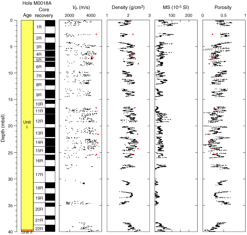 Figure F65. Velocity, bulk density, magnetic susceptibility, and porosity as a function of depth in Hole M0018A. Discrete measurements are superimposed (red circles).