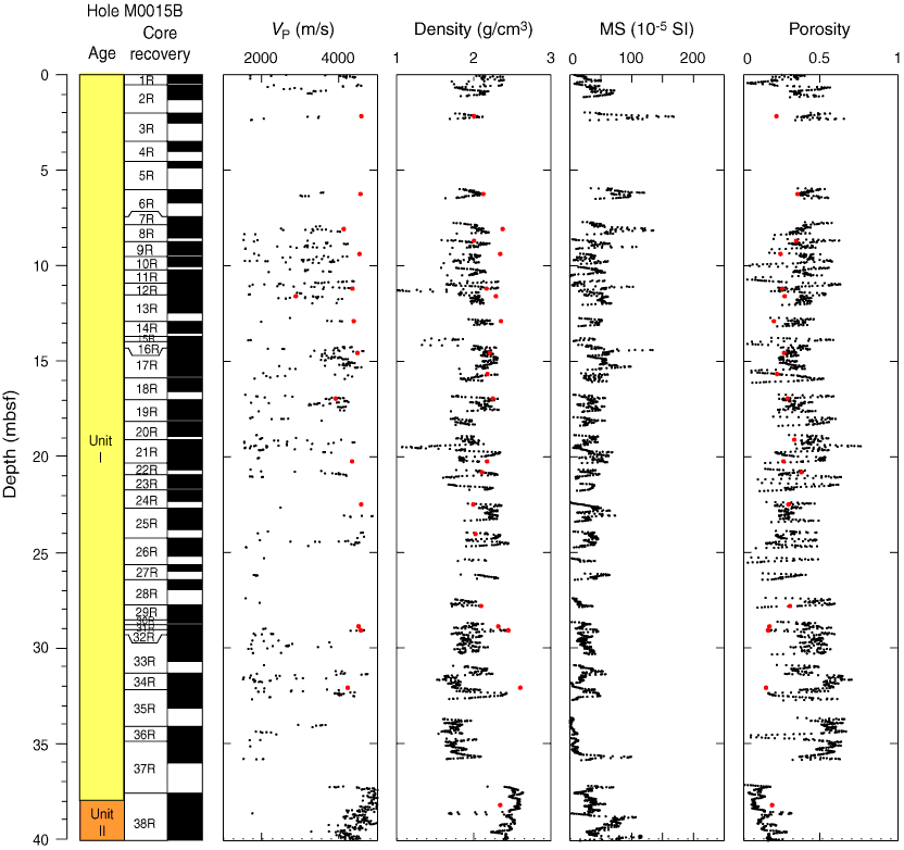 Figure F67. Velocity, bulk density, magnetic susceptibility, and porosity as a function of depth in Hole M0015B. Discrete measurements are superimposed (red circles).