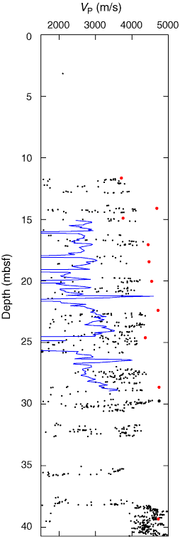 Figure F69. Comparison of MSCL velocity data (solid circles), downhole sonic log data (blue line), and discrete measurements (red circles) as a function of depth for Hole M0017A.