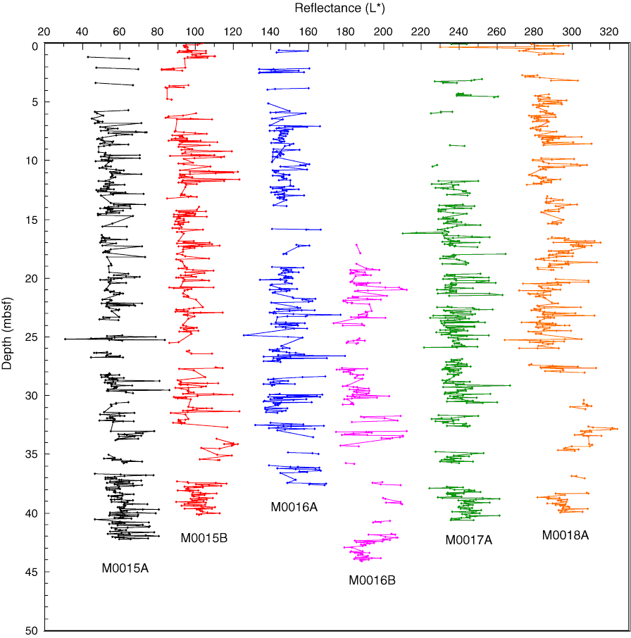 Figure F70. Color reflectance (L*) data from Holes M0015A, M0015B, M0016A, M0016B, M0017A, and M0018A. Holes M0015B, M0016A, M0016B, M0017A, and M0018A are offset from Hole M0015A by 40, 90, 130, 180, and 230 L* units, respectively.