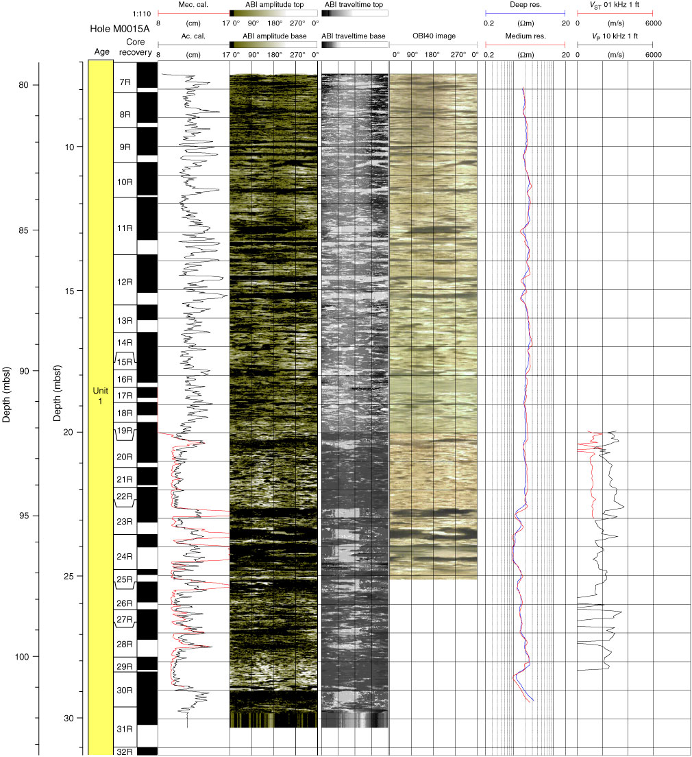 Figure F71. Wireline logging data, Hole M0015A. Mec. cal. = mechanical caliper, Ac. cal. = acoustic caliper extracted from ABI40, res. = resistivity.