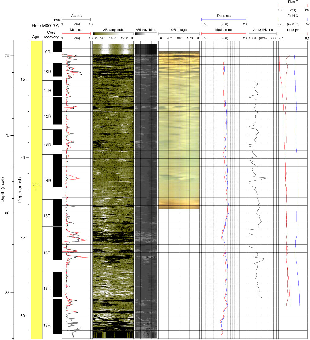 Figure F74. Wireline logging data, Hole M0017A. Ac. cal. = acoustic caliper extracted from ABI40, Mec. cal. = mechanical caliper, res. = resistivity, T = borehole fluid temperature, C = borehole fluid conductivity.