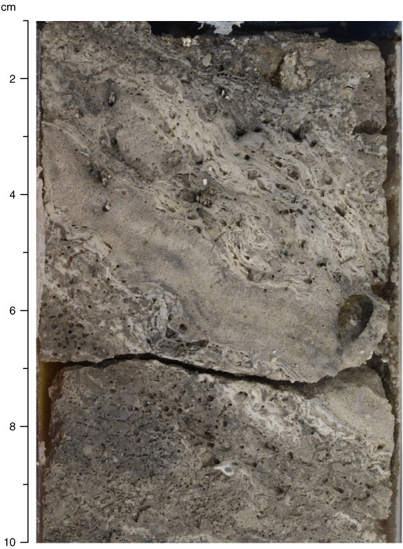 Figure F8. Encrusting colonies of Montipora and Porites encrusted with multiple thin crusts of coralline algae (Subunit IA; interval 310-M0017A-3R-CC, 1–10 cm).