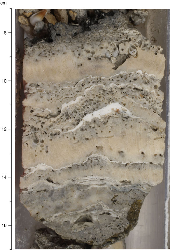 Figure F9. Multiple layers of encrusting agariciids (Pavona?) interlayered with coralline algal crusts (Subunit 1A; interval 310-M0017A-4R-1, 7–17 cm). Note strong bioerosion in corals.