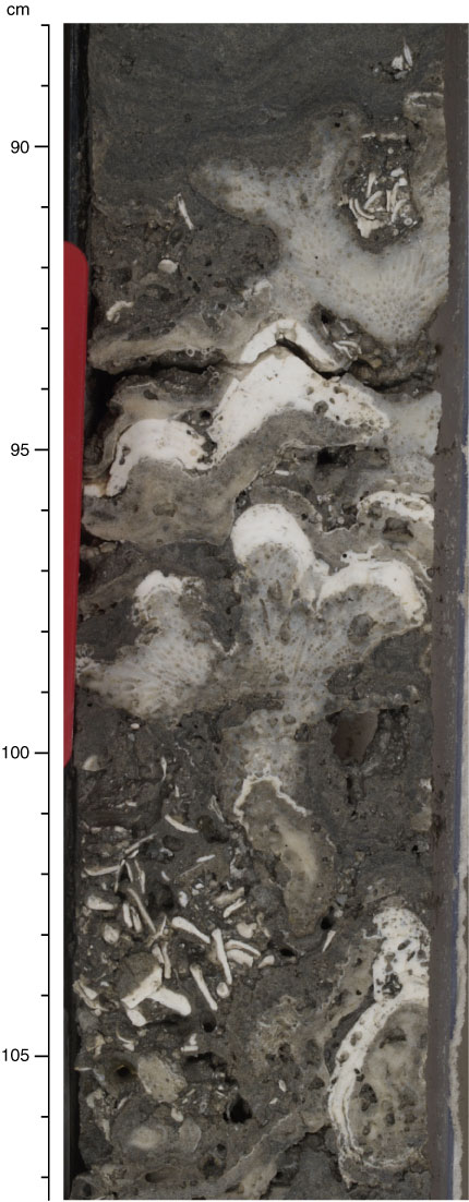 Figure F13. Coral framework of branching colonies of Pocillopora with thick coralline algal crusts on tips of branches and subsequent thick microbial encrustations (Subunit IA; interval 310-M0021A-5R-1, 88–107 cm). Note Halimeda segments in primary pore space.