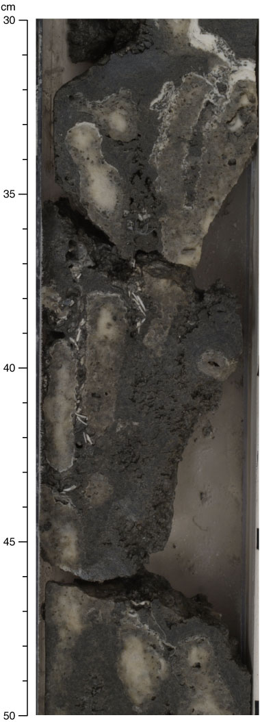 Figure F15. Coral framework of branching colonies of Porites with coralline algal crusts (thick crusts on tips in upper part of image) (Subunit IB; interval 310-M0021A-12R-1, 30–50 cm). Microbialite crusts represent last stage of encrustation. Note open primary pore spaces.