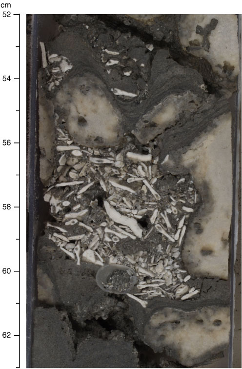 Figure F27. Pocket of coarse skeletal sand dominated by Halimeda segments in primary pore spaces of framework (Subunit IB; interval 310-M0025B-8R-1, 52–63 cm).