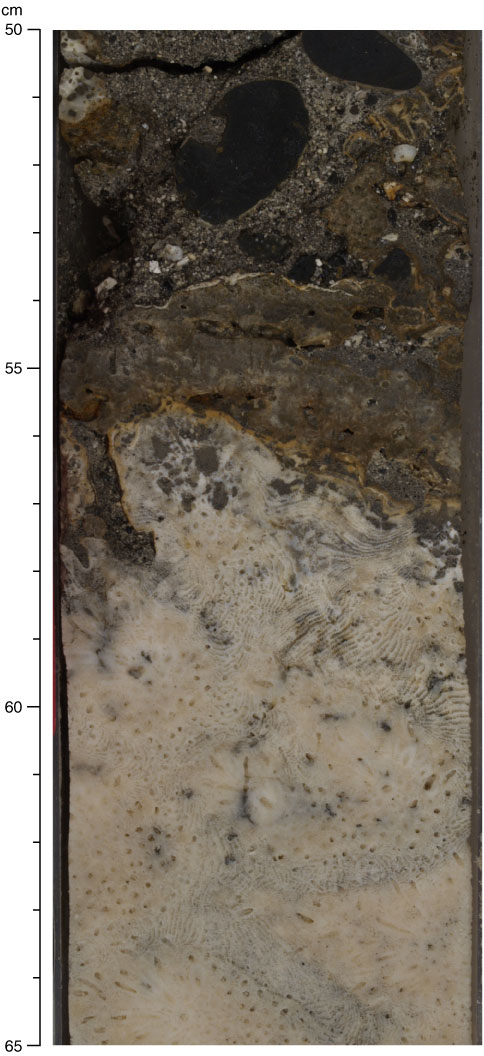 Figure F47. Tabular colony of Acropora covered with poorly sorted sediments, including volcanic gravels and pebbles (Subunit IIA; interval 310-M0025A-11R-1, 50–65 cm).