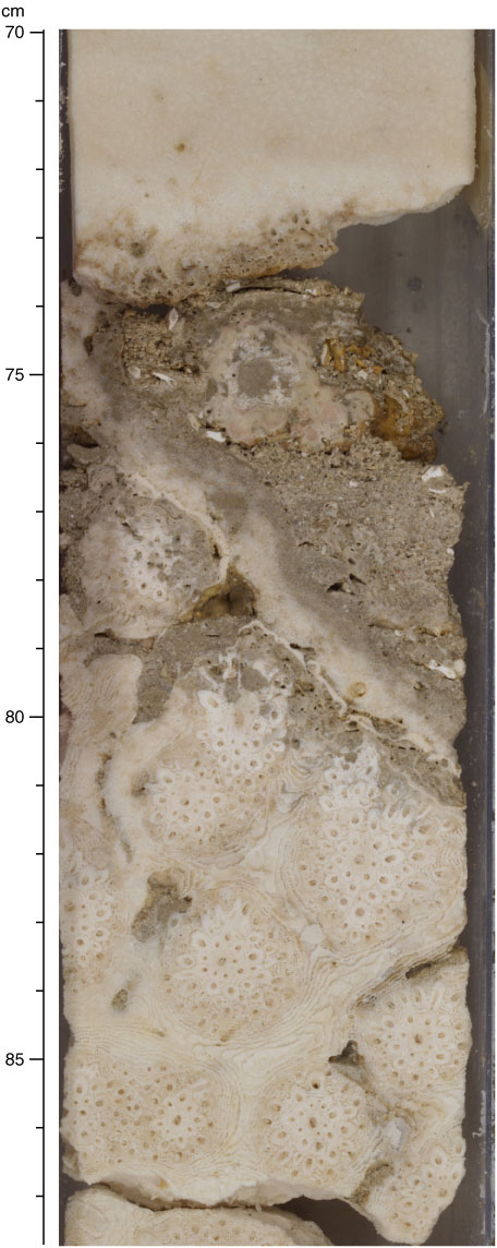 Figure F51. Tabular colony of Acropora (Subunit IIC; interval 310-M0009D-25R-1, 70–87 cm).