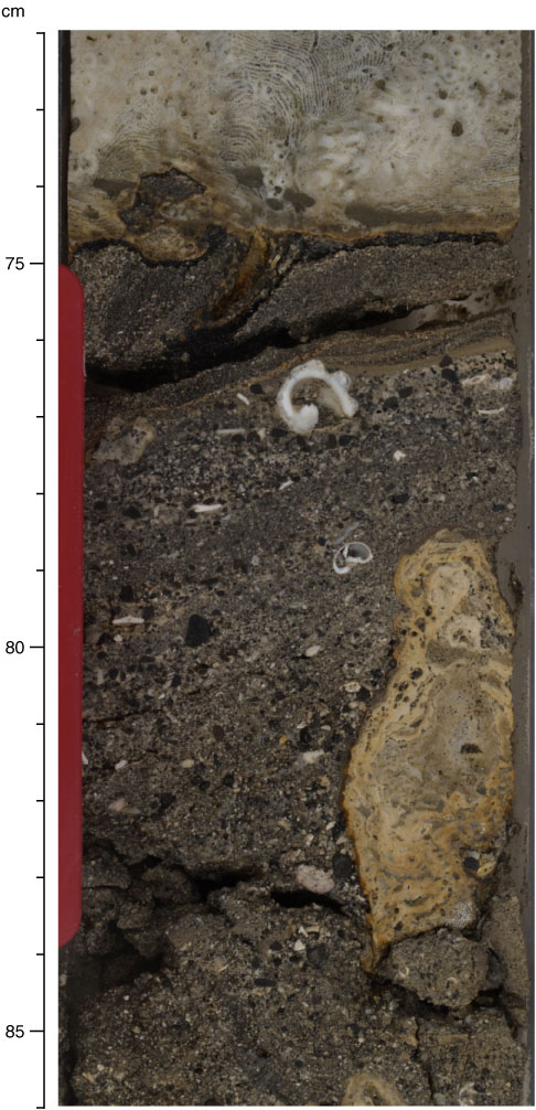 Figure F53. Poorly sorted grainstone with fragments of coralline algae and mollusks, crusts of coralline algae, and volcanic sand-sized grains and gravels (Subunit IID; interval 310-M0025A-11R-1, 72–86 cm).