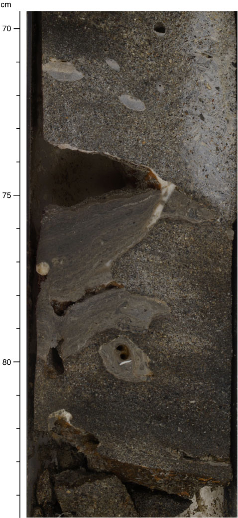 Figure F55. Volcanic-rich sediments with vugs infilled with finer sediment (Subunit IID; interval 310-M0025A-12R-2, 70–85 cm).
