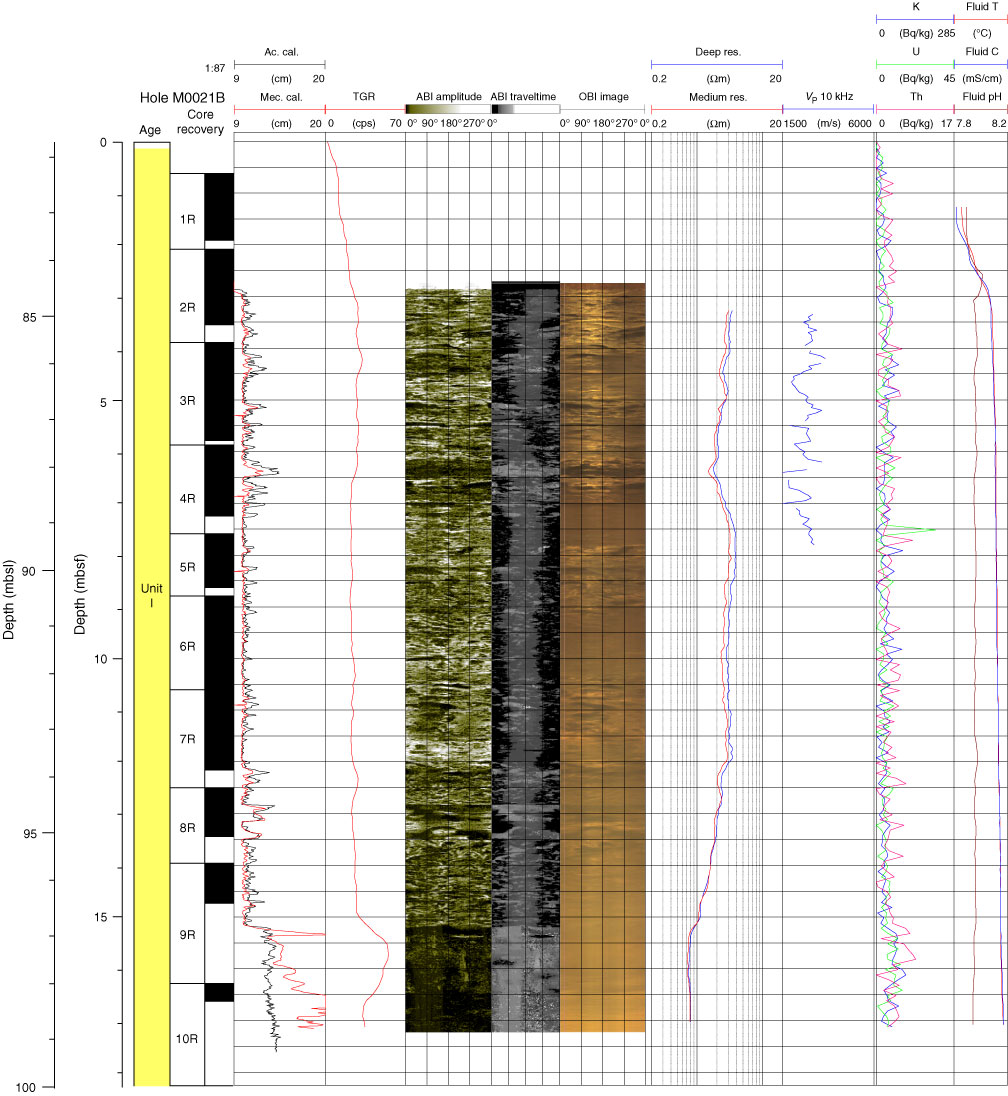Figure F77. Wireline logging data for Hole M0021B. Ac. cal. = acoustic caliper derived from ABI40, Mec. cal. = mechanical caliper, TGR = total gamma ray, res. = resistivity, T = borehole fluid temperature, C = borehole fluid conductivity.