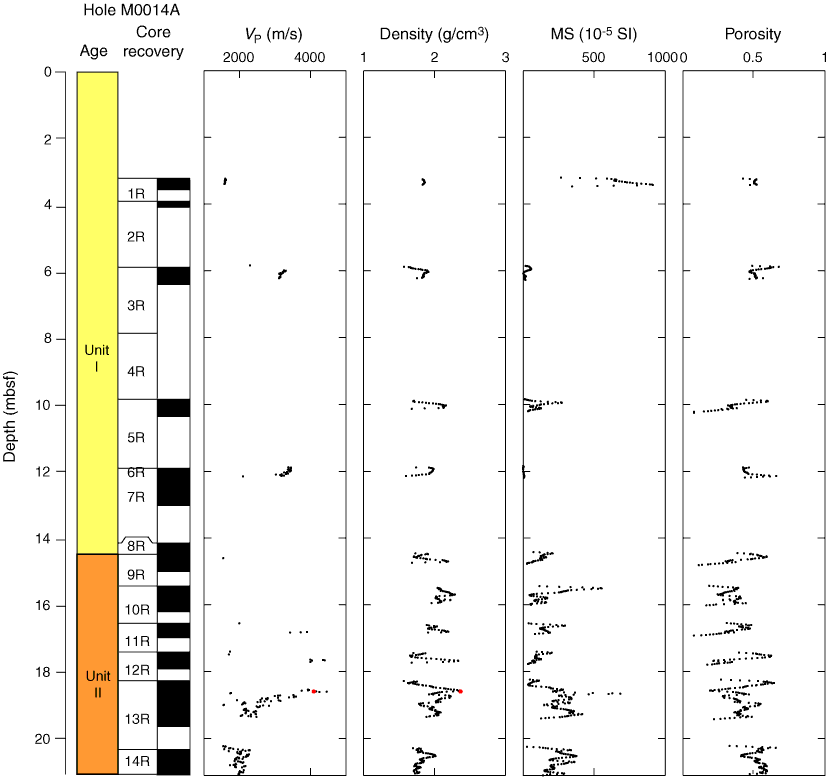 Figure F14. Velocity, bulk density, magnetic susceptibility, and porosity as a function of depth in Hole M0014A. Discrete measurements are superimposed (red circles).