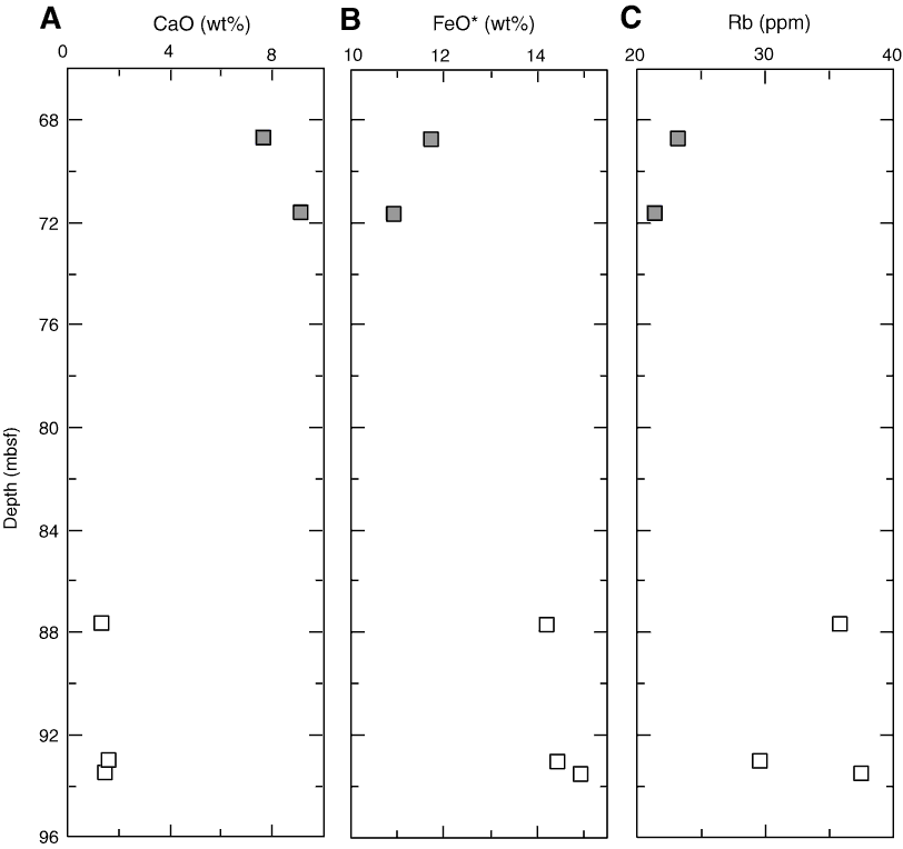 Figure F19. X-ray fluorescence results from select volcaniclastic sand/silt samples from Tiarei marginal sites. Note downhole compositional variation in (A) CaO, (B) FeO, and (C) Rb.