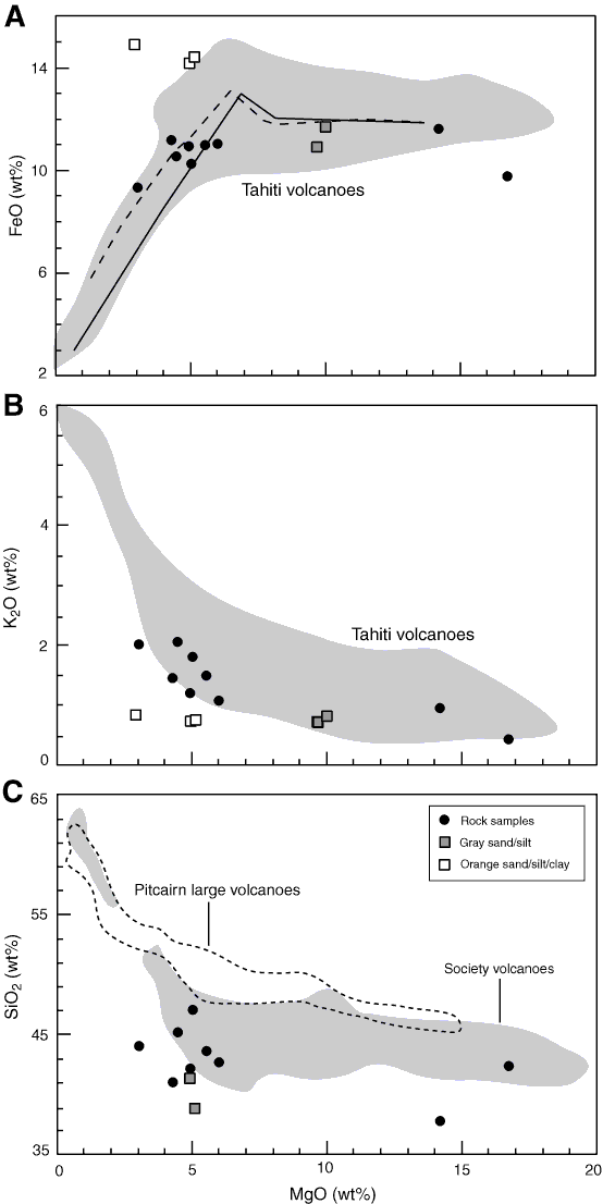 Figure F20. Analysis of igneous samples. A. MgO vs. FeO. B. MgO vs. K2O. C. MgO vs. SiO2.