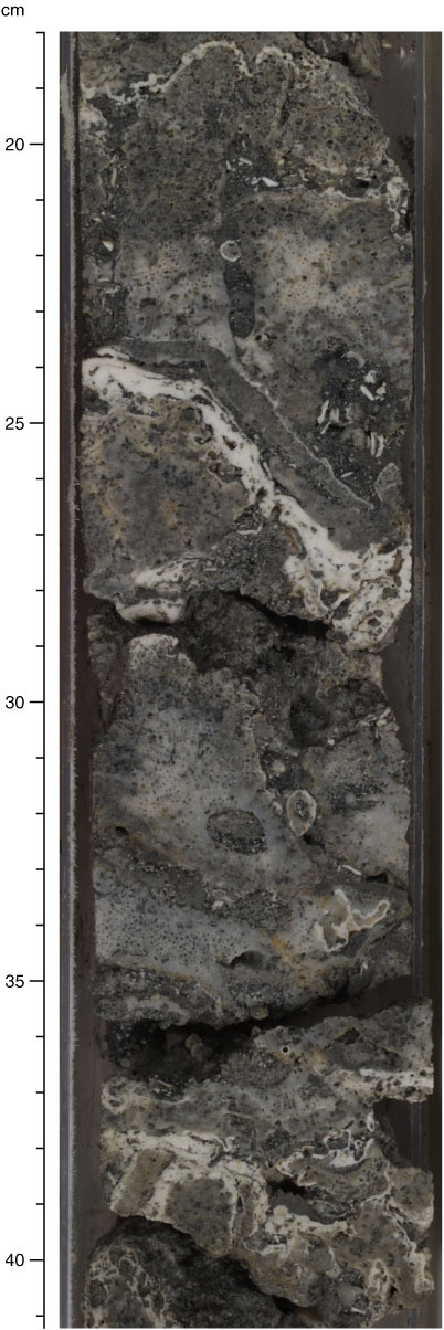 Figure F3. Robust branching colonies of Pocillopora with thick coralline algal crusts (Subunit IA; interval 310-M0012A-15R-1, 18–41 cm).