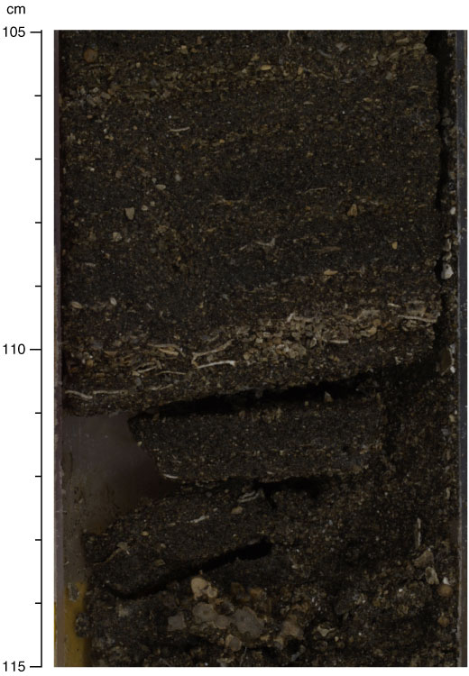 Figure F8. Sandy skeletal grainstone rich in Halimeda segments and fine to medium sand-sized volcanic grains (Unit II base; interval 310-M0014A-13R-1, 105–115 cm).