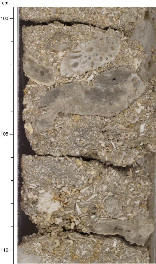 Figure F17. Skeletal rudstone with fragments of tabular Acropora and encrusting Porites and Halimeda segments (Subunit IIB; interval 310-M0019A-22R-1, 100–110 cm).