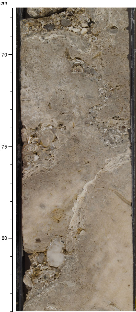 Figure F19. Massive colonies of Porites encrusted with multiple thin coralline algal crusts (Subunit IIC; interval 310-M0019A-27R-1, 68–84 cm). Primary pore space is filled with coarse skeletal sediment recording volcanic grains.