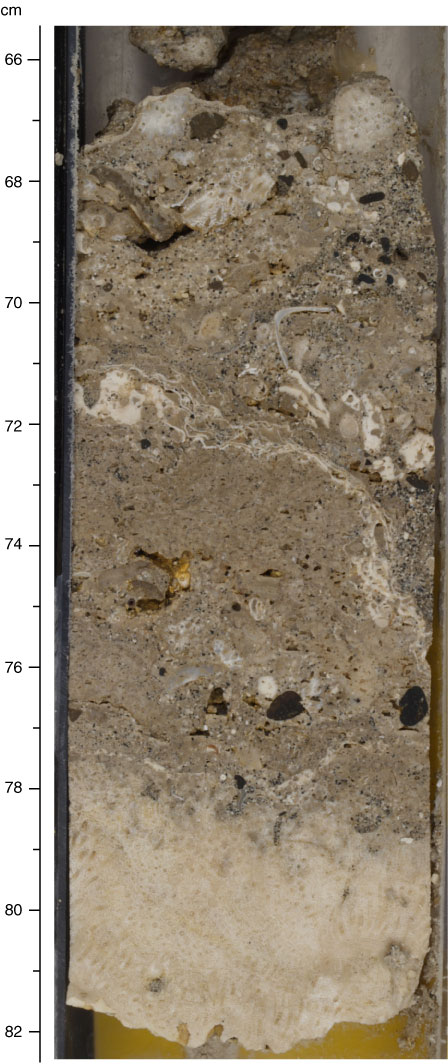 Figure F21. Poorly sorted skeletal rudstone with volcanic grains (Subunit IIC; interval 310-M0019A-32R-1, 66–82 cm). Note thin coralline algal crusts between 72 and 76 cm.