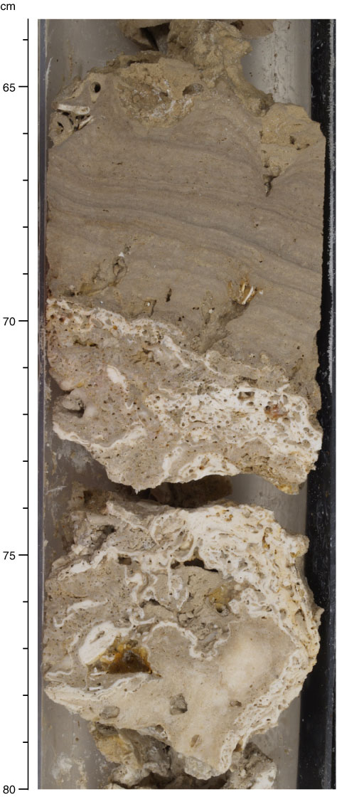 Figure F26. Encrusting colonies of Porites with multiple encrustations with coralline algae and very thick laminated microbialites (Unit II; interval 310-M0020A-12R-1, 64–80 cm). Note bioerosion of red algal crusts.