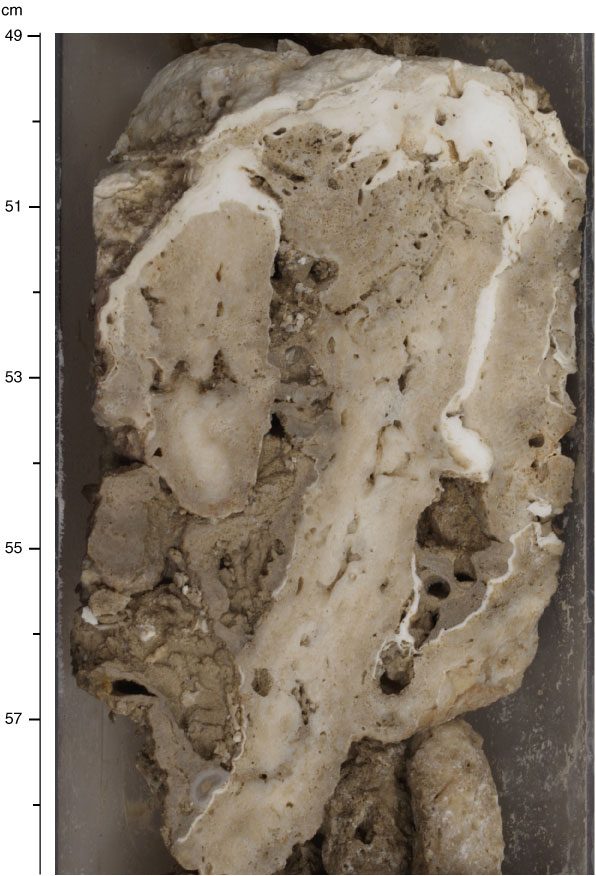 Figure F28. Tips of branching Porites colonies encrusted with coralline algae (Unit II; interval 310-M0020A-18R-1, 49–58 cm).