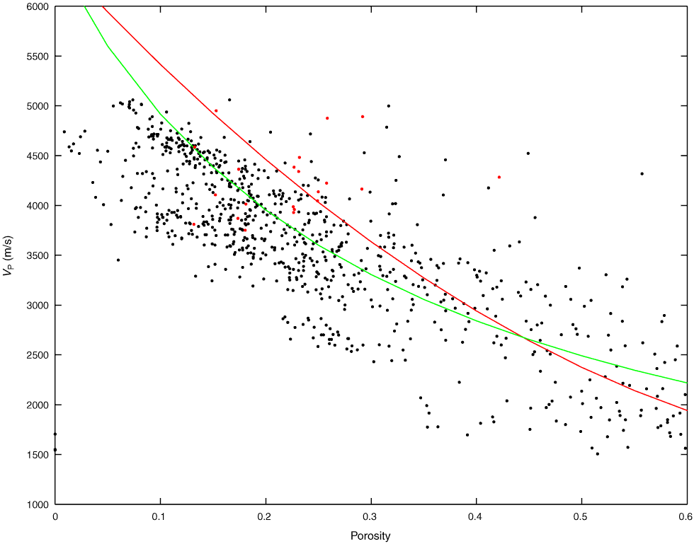 Figure F38. Cross plot of porosity with velocity for Site M0019. Solid lines refer to the Wyllie time average equation (red) and Raymer modified time average equation (green) for a matrix velocity of calcite (6530 m/s). Discrete measurements are superimposed (red circles).