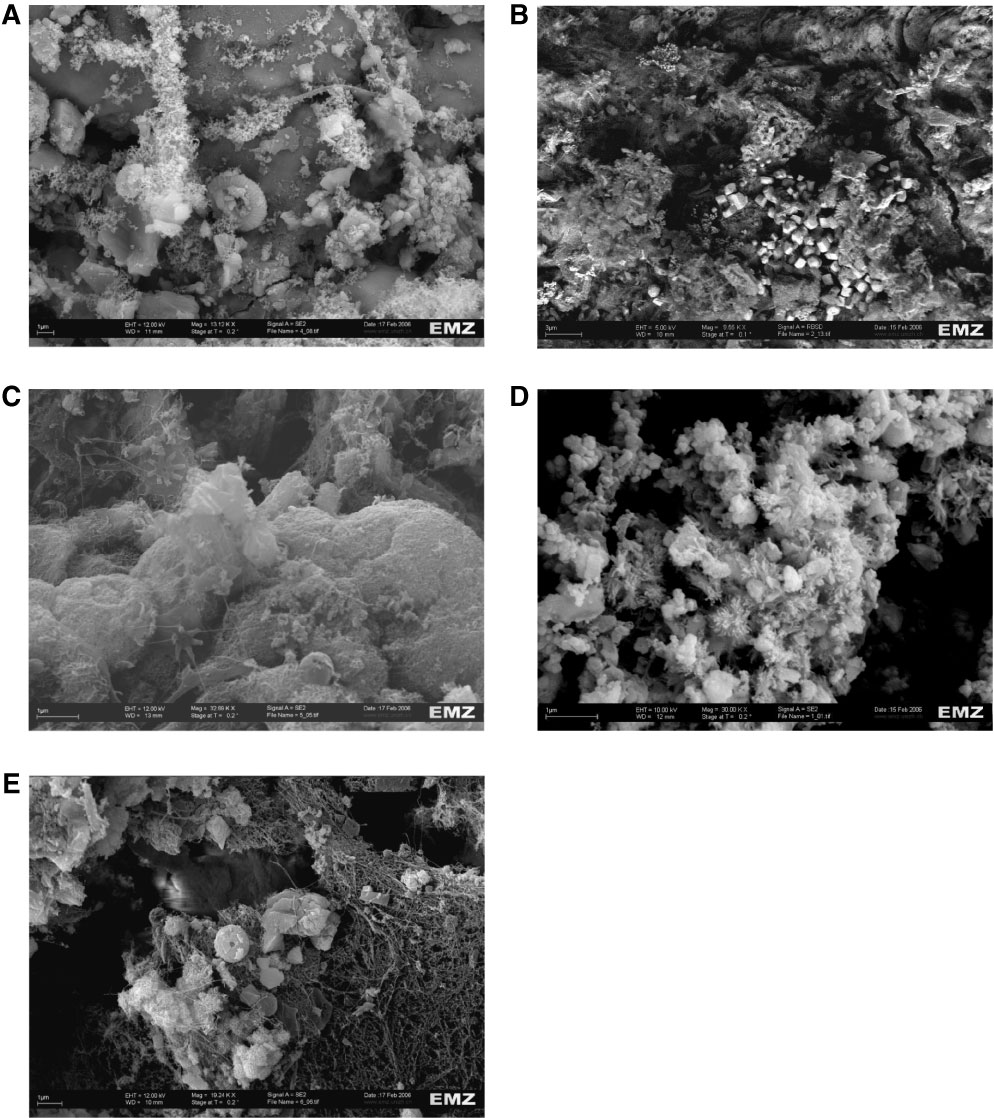 Figure F4. Glutaraldehyde-fixed samples. A. Surface of microbialites (magnification = 13,100-fold) (Hole M0020A, 4.51 mbsf). B. Surface of microbialites with pyrite crystals (magnification = 9,550-fold) (Hole M0023A, 0.12 mbsf). C. EPS-covered surface of microbialites with attached polyp larvae and possibly one coccoid bacterium in the foreground (magnification = 32,700-fold) (Hole M0024A, 11.88 mbsf). D. Surface of microbialites with some fiber type minerals, most probably clay minerals (magnification = 30,000-fold) (Hole M0007C, 5.88 mbsf). E. Surface of blue biofilm covered with a network of desiccated EPS minerals, presumably calcium carbonate and microorganisms (magnification = 19,200-fold) (Hole M0015B, 0.47 mbsf).