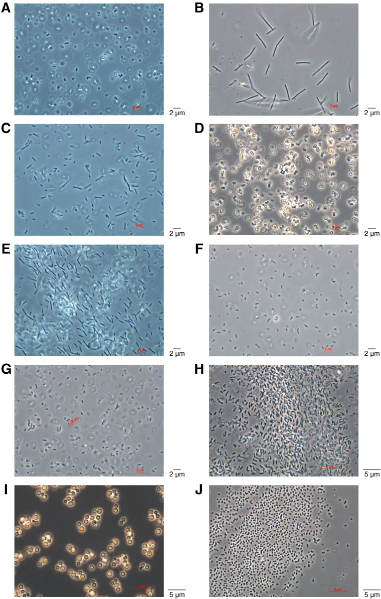 Figure F6. Light microscopy of pure cultures obtained during Expedition 310 (phase contrast; magnification = ~1000×). Letters correspond to Table T2. A. Interval 310-M0009D-5R-1, 1 cm. B. Interval 310-M0015B-2R-1, 0 cm. C. Interval 310-M0009D-5R-1, 1 cm. D. Interval 310-M0020A-6R-1, 12 cm. E. 310-M0024A-1R-1, 68 cm. F. 310-M0007C-3R-CC, 38 cm. G. Interval 310-M0020A-6R-1, 12 cm. H. 310-M0005E-1M-1, 33 cm. I. 310-M0024A-1R-1, 68 cm. J. Interval 310-M0016A-7R-1, 5 cm.