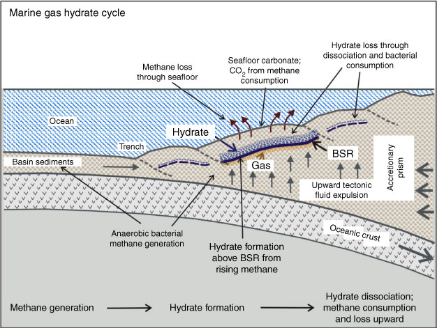 Figure F2. Marine gas hydrate cycle (after Hyndman and Davis, 1992). BSR = bottom-simulating reflector.