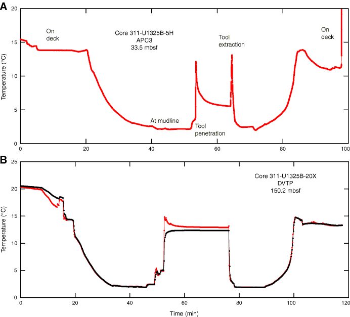 Figure F16. A. Typical advanced piston corer temperature (APCT) tool and third-generation advanced piston corer temperature (APCT-3; APC3 in figure) tool temperature history. B. Davis-Villinger Temperature Probe (DVTP) temperature history showing the different responses of the two thermistors (purple = lower, black = upper) on the probe.