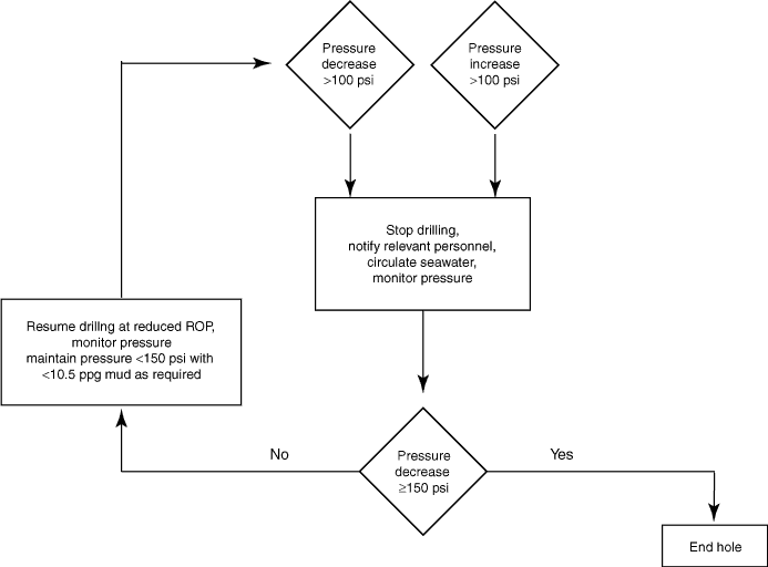 Figure F27. Decision tree used in gas monitoring based on LWD/MWD borehole fluid pressure measurements. Pressure increases were also monitored because they may be precursors to a gas flow pressure decrease. ROP = rate of penetration.