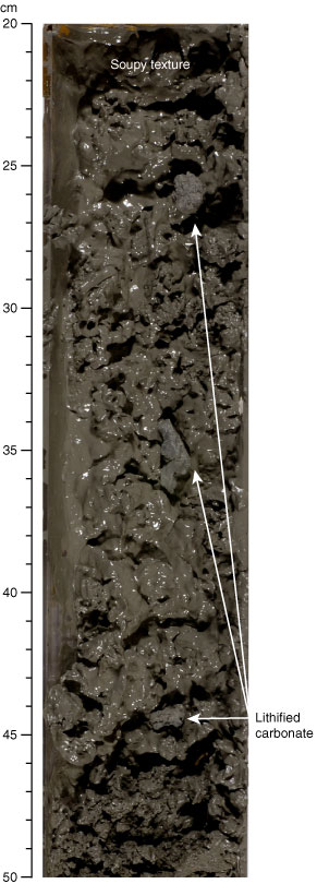 Figure F7. Example of soupy sediment texture (interval 311-U1328B-6X-1, 20–50 cm).