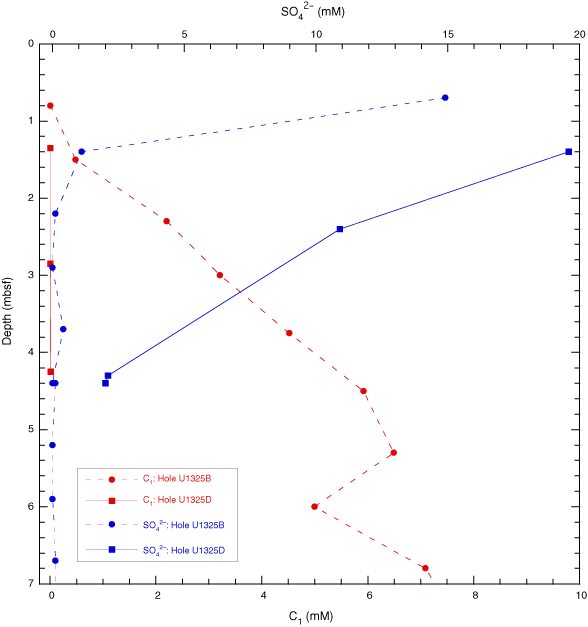 Figure F32. Dissolved sulfate and methane concentrations from Site U1325. The sulfate profile from Hole U1325D reflects the actual distribution of sulfate in the near-surface sediments. The sulfate/methane interface depth in Hole U1325B is most likely incorrect because Core 311-U1325B-1H missed the mudline.