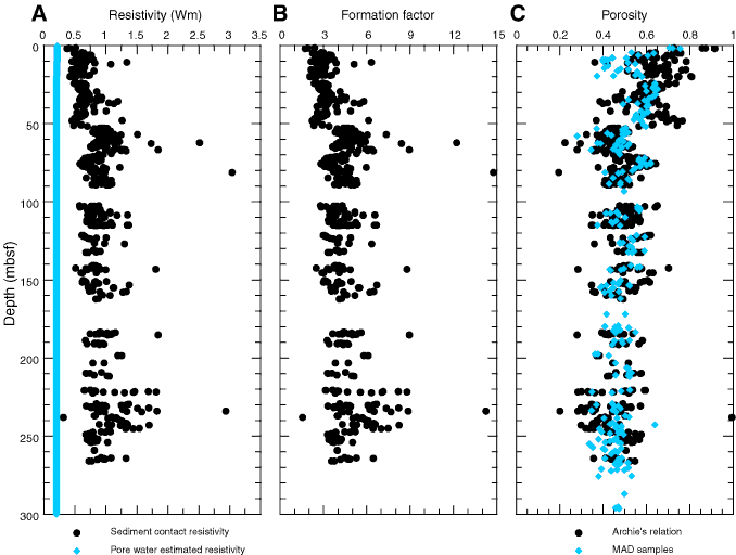 Figure F42. A. Comparison of pore water resistivity calculated from interstitial water salinity, using equations developed by Fofonoff (1985), and bulk volume contact resistivity of sediments from Site U1325. Both sets of values have been corrected to 20°C. B. Formation factor (ratio of pore water resistivity to sediment resistivity). C. Comparison of porosity derived from moisture and density (MAD) measurements and Archie's equation. (Continued on next page.)