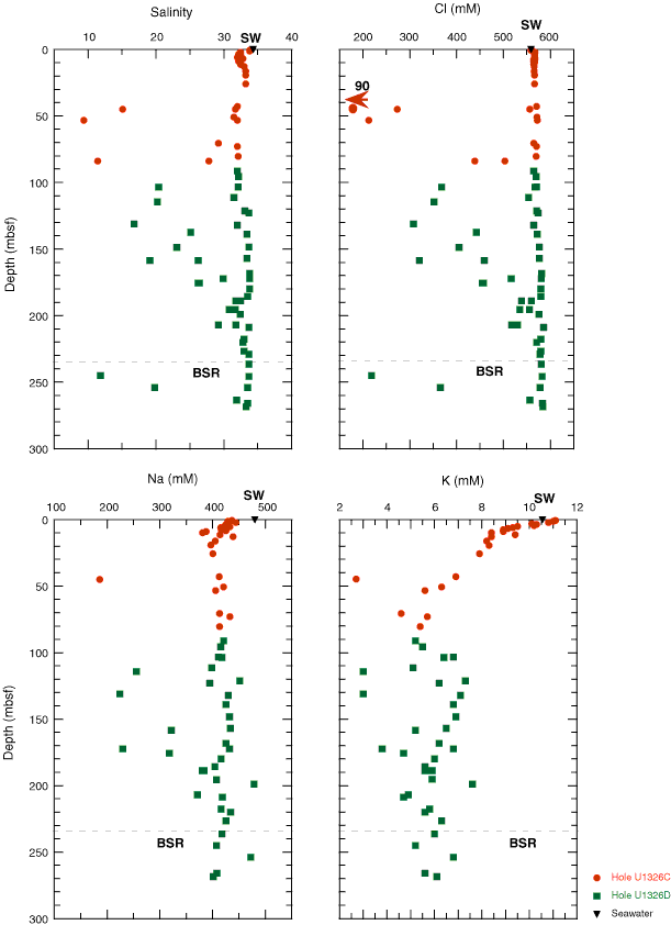Figure F21. Concentration vs. depth profiles of salinity, chloride, sodium, and potassium in interstitial waters from Holes U1326C (red circles) and U1326D (green squares). SW = seawater, BSR = seismically inferred bottom-simulating reflector.