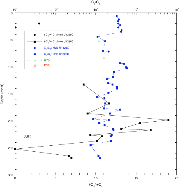 Figure F27. C1/C2 and i-C4/n-C4 ratios in void gas, gas hydrate (HYD), and PCS gas samples from Site U1326. BSR = bottom-simulating reflector, HYD = gas hydrate, PCS = Pressure Core Sampler.