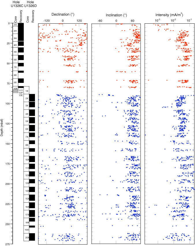 Figure F41. Paleomagnetic data after 20 mT alternating-field demagnetization from Holes U1326C and U1326D.