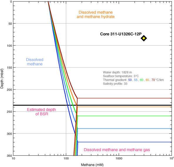 Figure F44. Methane phase diagram with total methane concentration measured from the single degassed PCS core at Site U1326. The seafloor temperature was estimated from previous sites, the salinity profile was taken from Table T4, and methane saturation was calculated according to Xu (2002, 2004). Methane phase boundaries for five different thermal gradients are plotted, as in situ temperature measurements were extremely difficult at this site (see "In situ temperature profile"). BSR = bottom-simulating reflector.