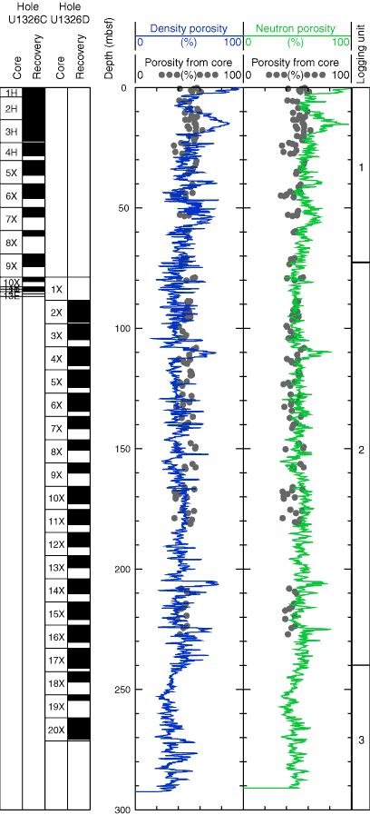 Figure F56. Comparison of LWD porosity logs with core-derived porosity data.
