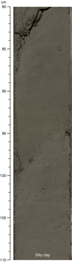 Figure F8. Dipping silty clay showing gradual color changes from dark greenish gray to dark gray in lithostratigraphic Unit I (interval 311-U1326C-3H-3, 80–110 cm). The greenish intervals have more abundant diatoms (as much as 10%).