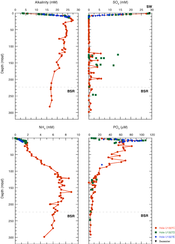 Figure F23. Concentration vs. depth profiles of alkalinity, sulfate, ammonium, and phosphate in interstitial waters from Holes U1327C, U1327D, and U1327E. SW = seawater, BSR = seismically inferred bottom-simulating reflector.