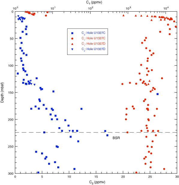 Figure F27. Concentrations of methane and ethane in headspace gas samples from Site U1327. BSR = bottom-simulating reflector.