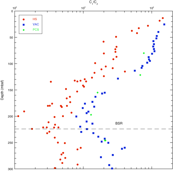 Figure F29. C1/C2 ratios in headspace gas (HS), void gas (VAC), and pressure core sampler (PCS) gas samples from Site U1327. BSR = bottom-simulating reflector.