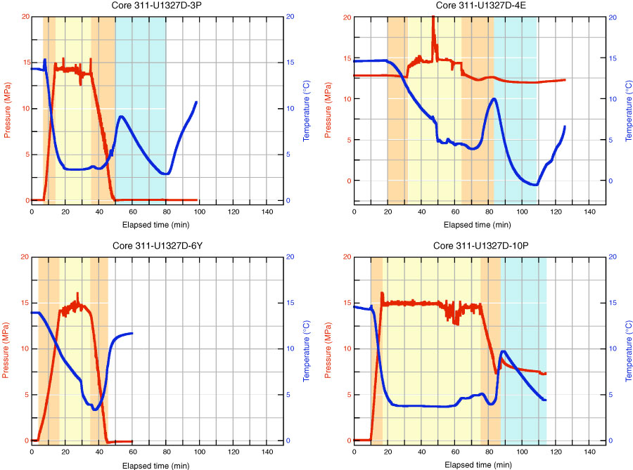 Figure F47 (continued). Temperature and pressure vs. elapsed time. (Continued on next page.)