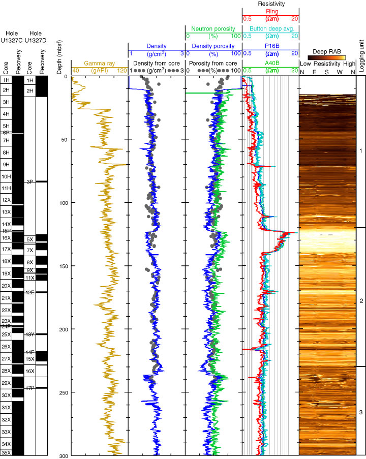 Figure F55. Summary of LWD data from Hole U1327A. P16B = phase-shift resistivity measured by the EcoScope tool at a source-receiver spacing of 16 in (41 cm), A40B = attenuation resistivity measured by the EcoScope tool at a source-receiver spacing of 40 in (102 cm), RAB = resistivity-at-the-bit image obtained by the GeoVISION tool.